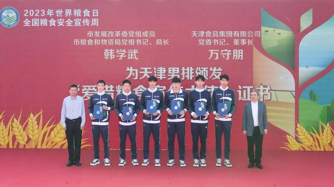 韓學(xué)武、萬(wàn)守朋為天津食品集團(tuán)男排頒發(fā)“愛(ài)惜糧食宣傳大使”證書。旨在進(jìn)一步宣傳節(jié)約光榮、浪費(fèi)可恥的思想觀念,倡導(dǎo)全民健身活動(dòng),倡導(dǎo)健康文明的新生活方式。