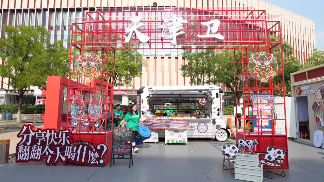 在展位設(shè)計(jì)上,結(jié)合天津地方特色,將中國紅與海河花色奶的“多姿多彩”相融合,創(chuàng)設(shè)“天津衛(wèi)”門頭吸引打卡拍照;搭建翻翻墻,市民可根據(jù)不同話題翻看不同產(chǎn)品,充滿趣味互動性。售賣牛奶的牛奶巴士動感十足,將牛奶花紋與“哪吒IP”形象相融合,可愛又富有活力。