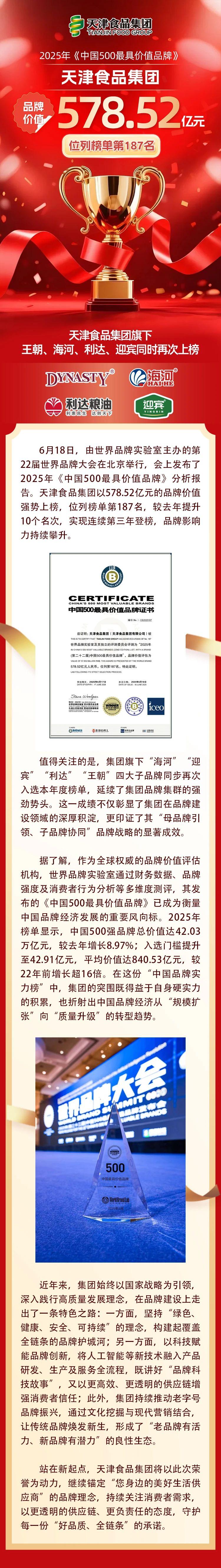 集團(tuán)連續(xù)三年榮登“中國(guó)500最具價(jià)值品牌”榜單 旗下王朝、海河、利達(dá)、迎賓再次同時(shí)上榜