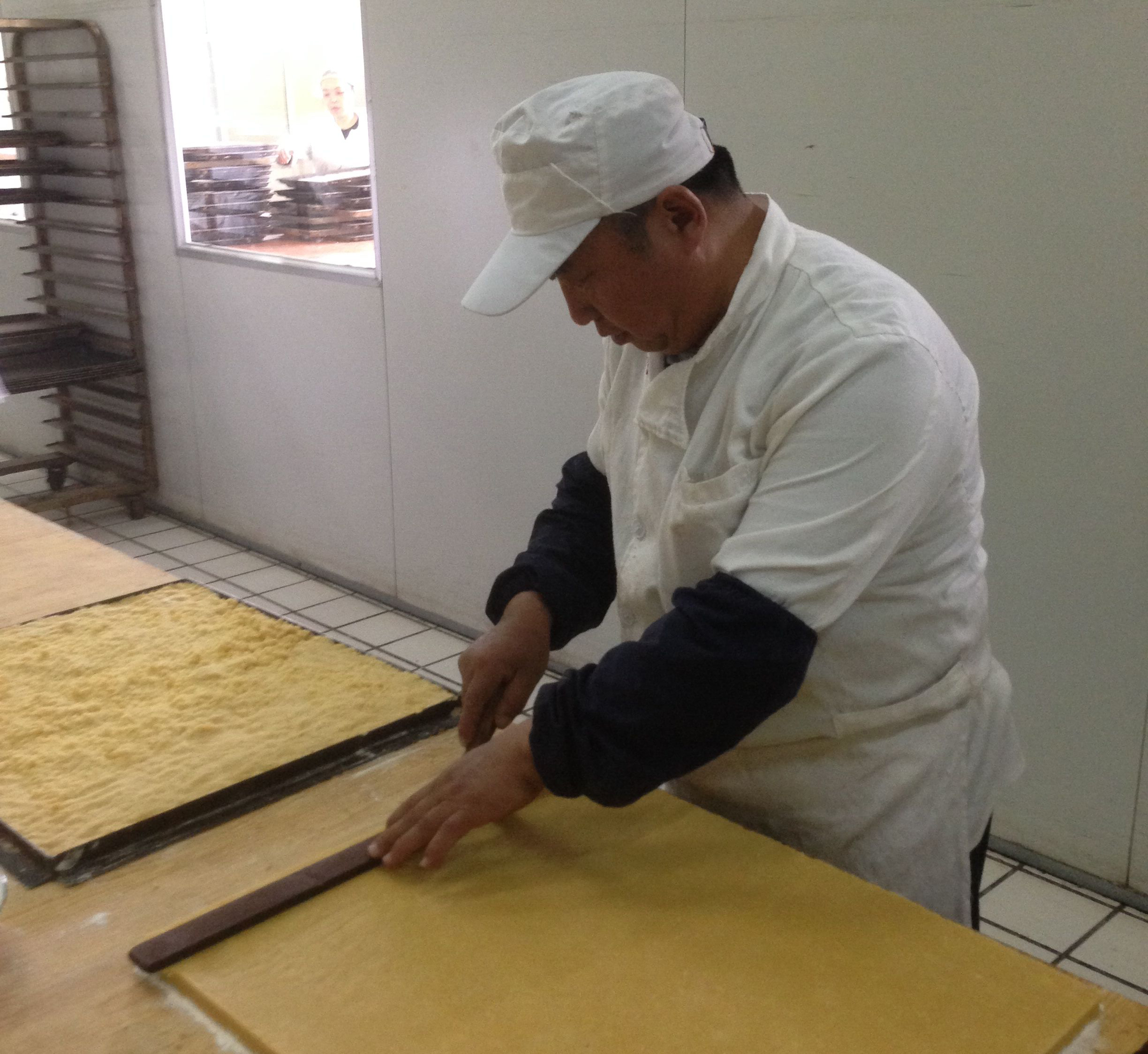 “蘇打餅干整個(gè)制作要花費(fèi)6個(gè)多小時(shí),其中醒面就占了將近4個(gè)多小時(shí)。這是一種清酥面的搟法,面皮和完以后裹上油之后再搟,所以要求面必須醒到位。另外需要注意的就是搟面的手法。搟制的過程中,面皮擱到桌面上要能清晰地看到面皮上的紋路,而且要均勻。”賈少春說起“蘇打餅干”的制作工藝如數(shù)家珍。